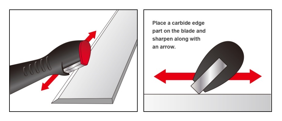 - Pentru a ascuți lame : Așezați muchia din carbură de tungsten a ascuțitorului pe lama care necesită ascuțire. Glisați ascuțitorul înainte și înapoi de-a lungul lamei.