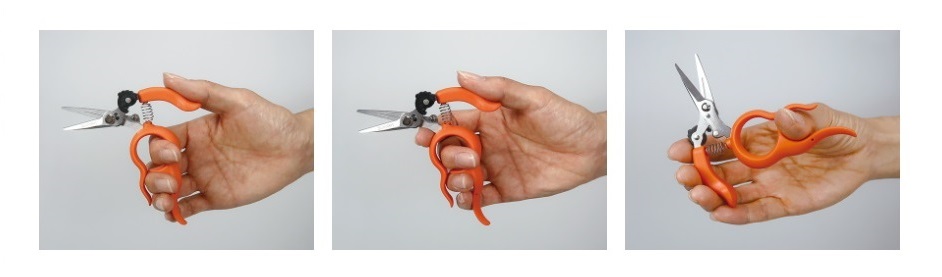 - Figura 2. (de la stânga la dreapta): Priză pentru mâini mici . Culesul florilor, ciupirea, tăierea vlăstarelor de căpșuni , tăierea sforii etc. Pentru a evita accidentările, degetul arătător trebuie să țină mânerul .