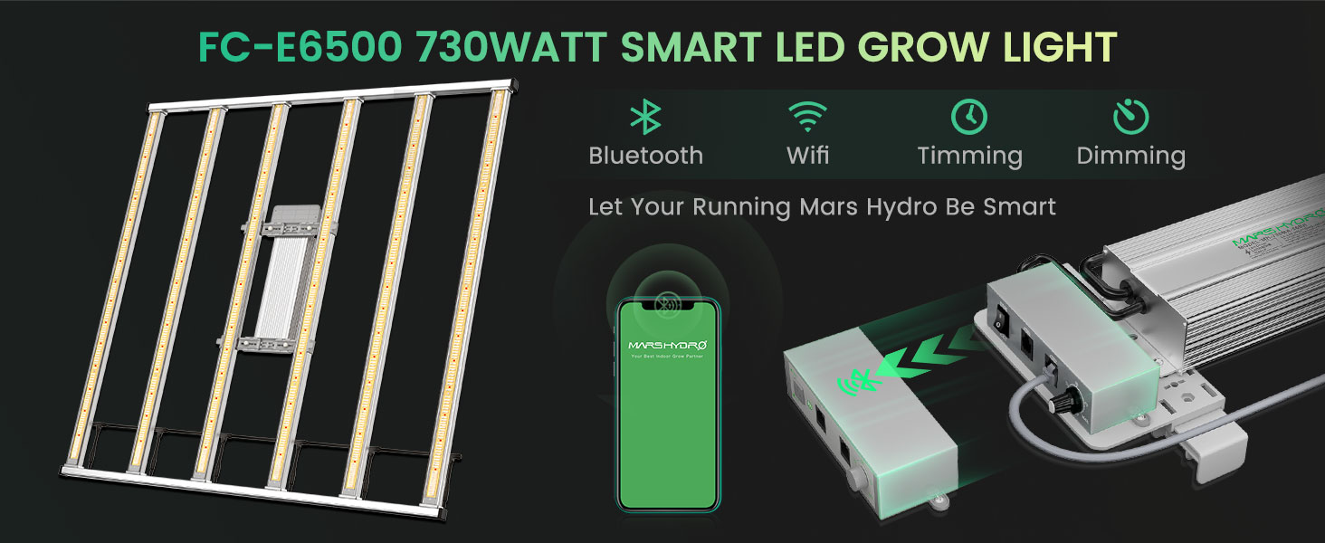Mars Hydro Smart FC-E 6500 730W LED Grow Light este o diodă profesională / iluminat LED pentru cultivarea plantelor în interior . 3546 buc. LED-urile BridgeLux , amplasate într-o combinație specială, asigură o distribuție uniformă , lumină mai pătrunzătoare cu un spectru complet și o eficiență ridicată de 2,8 μmol/J , suficientă pentru întreaga perioadă de creștere a plantei ! FC-E 6500 înlocuiește performanța unui bec HPS de 1000W !