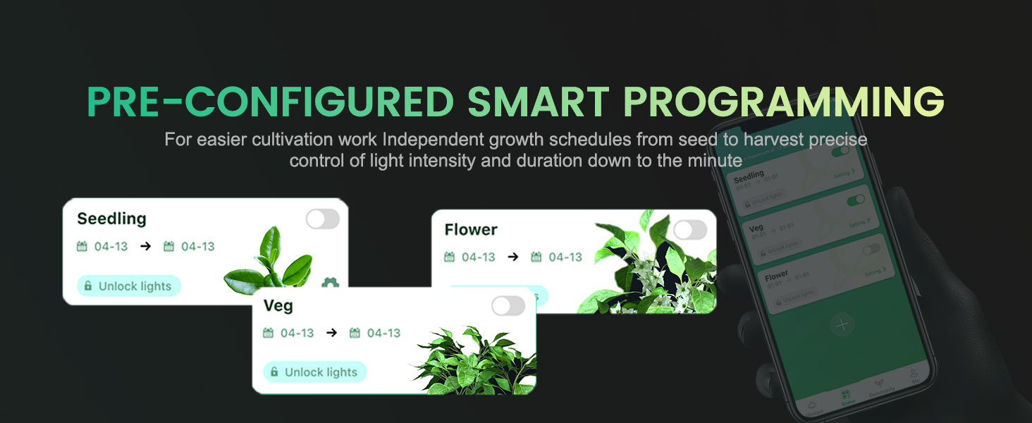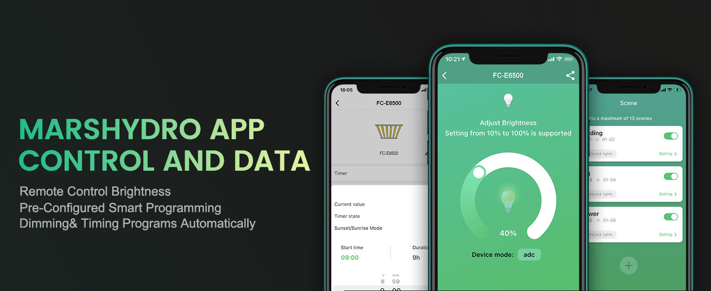 - Mars Hydro Smart Smart Grow System: lămpile inteligente de creștere din seria FC-E acceptă controlul mobil și programarea unui plan de cultivare prin intermediulaplicației Mars Hydro . Configurație precisă a intensității până la lună/zi/oră/minut pentru a obține niveluri dinamice de lumină și simularea răsăritului și apusului soarelui pentru a imita fotoperioada naturală la plante. Toate datele și setările sunt stocate și transferate prin tehnologia OTA , astfel încât utilizatorii pot avea acces instantaneu la cele mai recente actualizări prin WiFi.