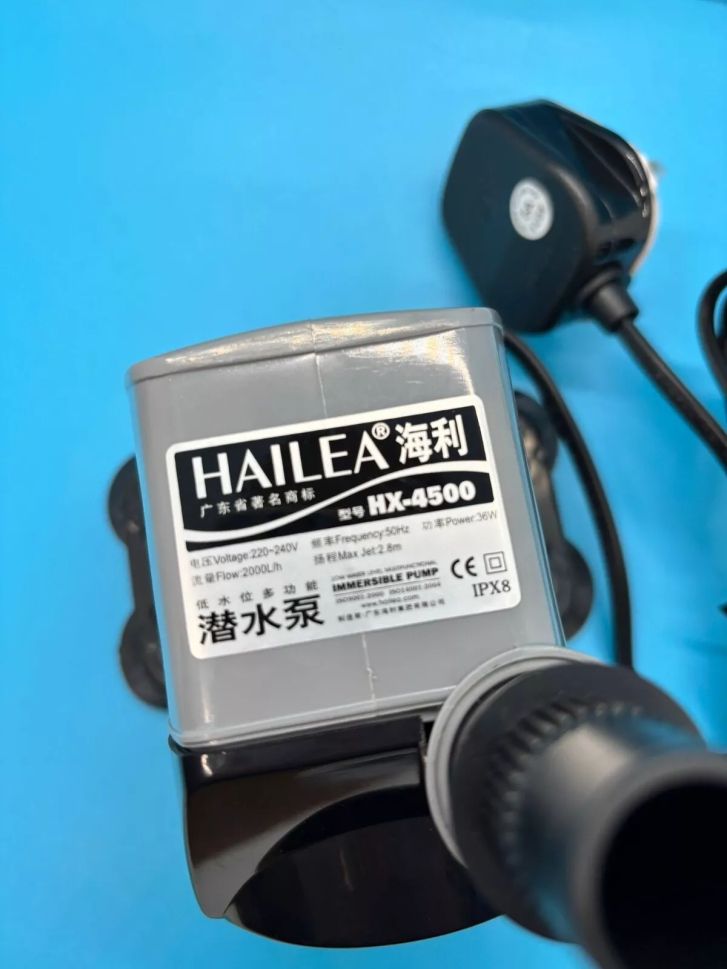 Compact and efficient submersible pump Hailea HX-4500 with a flow rate of up to 2,000 l/h and a head of up to 2.8 m - suitable for ponds, fountains, feeding and circulation systems. Includes a mixer for aerating the solution designed for continuous use works well with a low water level in the tank built-in flow regulator applicable for NFT and Flood-and-Drain suction cups for secure attachment to the tank