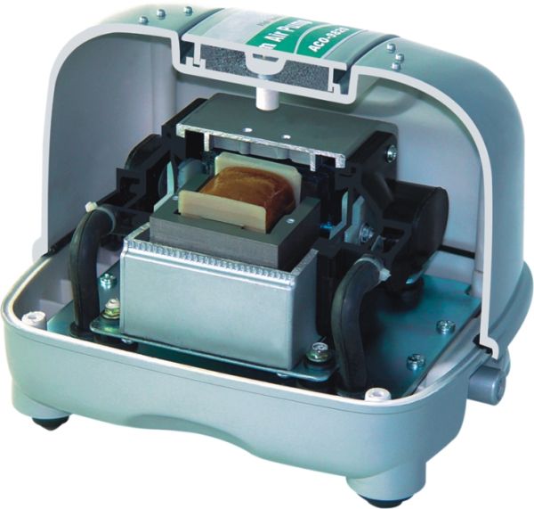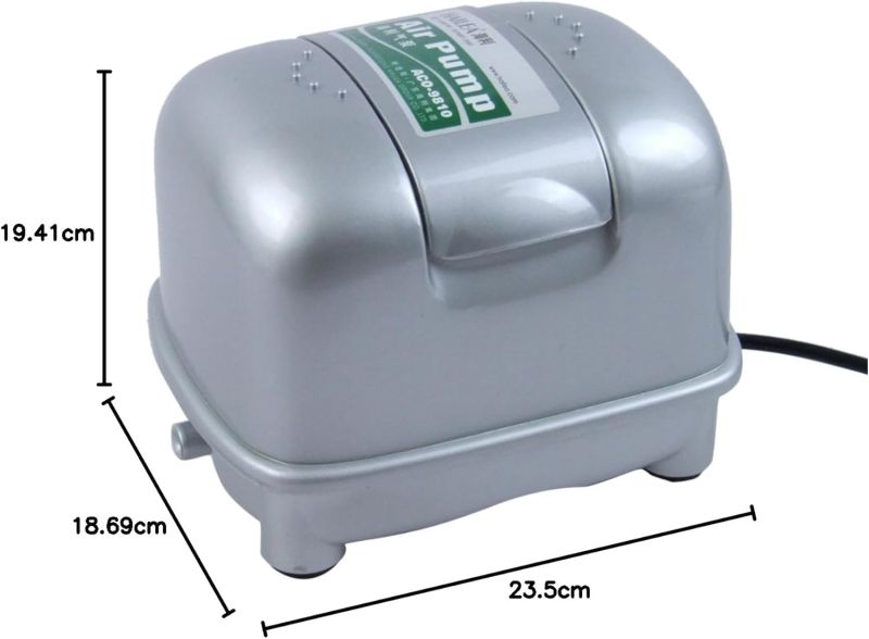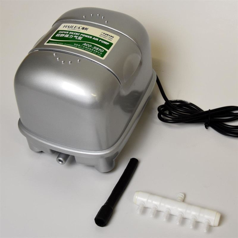 Quiet and powerful Hailea ACO-9820 air pump, providing up to 60 L/min (3,600 L/h) through 10 outputs, with soundproof construction and waterproof housing.
