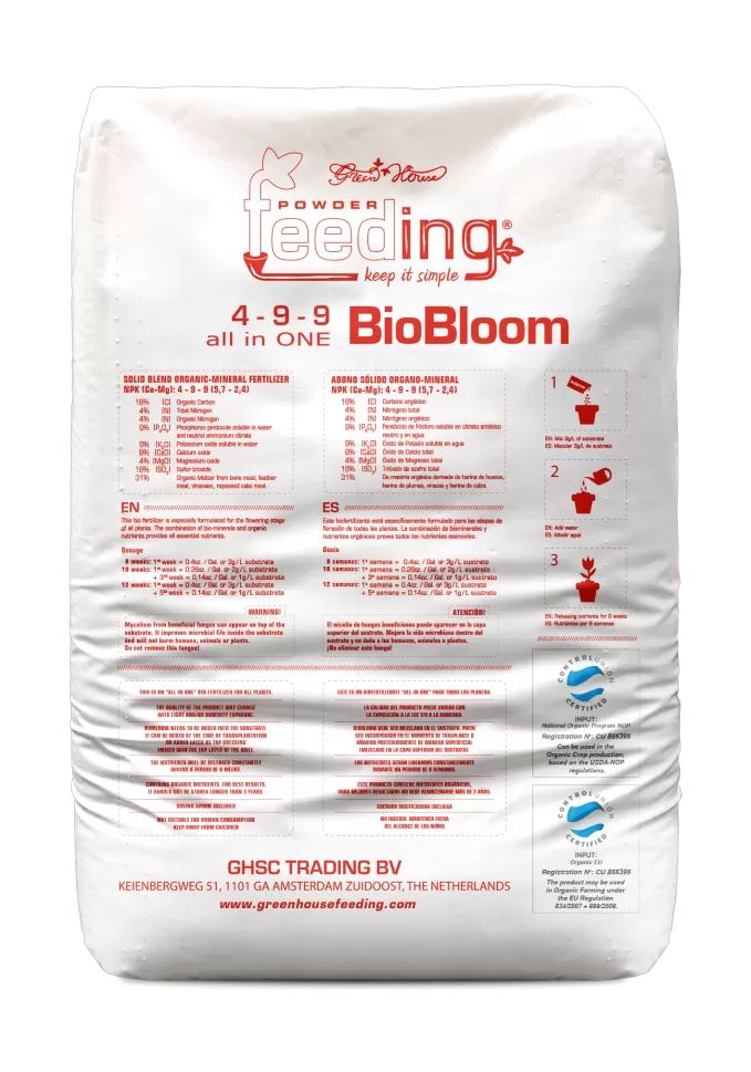 GH Powder Feeding Bio Bloom este un îngrășământ organic sub formă de pudră pentru faza de înflorire , potrivit pentru toate tipurile de plante. Conține toate microelementele necesare pentru obținerea unui randament excelent. Ingredientele sale naturale încurajează dezvoltarea microorganismelor benefice din sol.