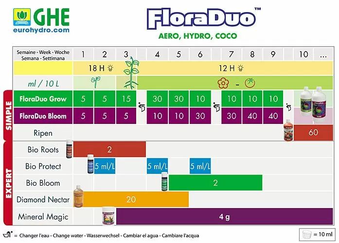 GHE Flora Duo Grow H/W 1l. parte a îngrășământului bicomponent extrem de concentrat GHE DualPart pentru cultivarea în sol, hidroponică sau în substrat de cocos. Doar două sticle - Grow și Bloom sunt tot ce au nevoie plantele tale de la începutul până la sfârșitul recoltei . Cu DualPart începi cu cantități egale de Grow și Bloom în timpul înrădăcinării sau dezvoltării timpurii, în creșterea vegetativă - mai mult Grow decât Bloom, iar în înflorire și fructificare - mai mult Bloom decât Grow. Este atât de simplu!