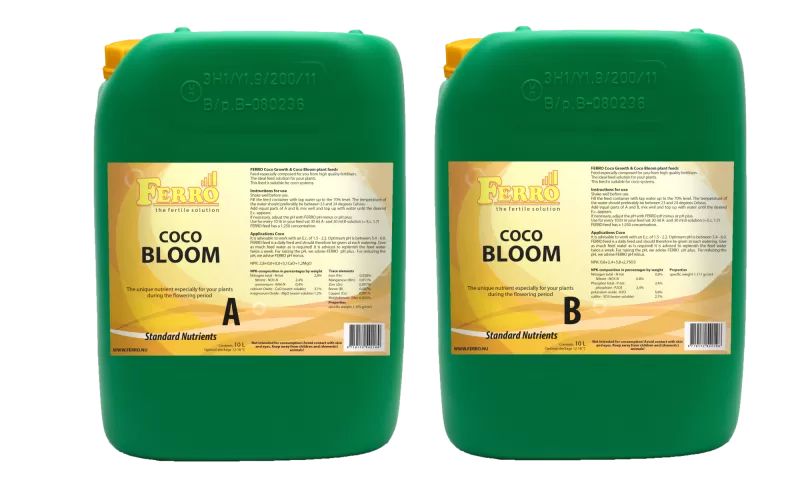 Ferro COCO BLOOM A&B 2x1l. este un îngrășământ complet bicomponent pentru faza de înflorire a plantelor cultivate în substrat de cocos . Pentru rezultate perfecte , utilizați acest produs de înaltă calitate la fiecare udare , pe tot parcursul fazei de înflorire!