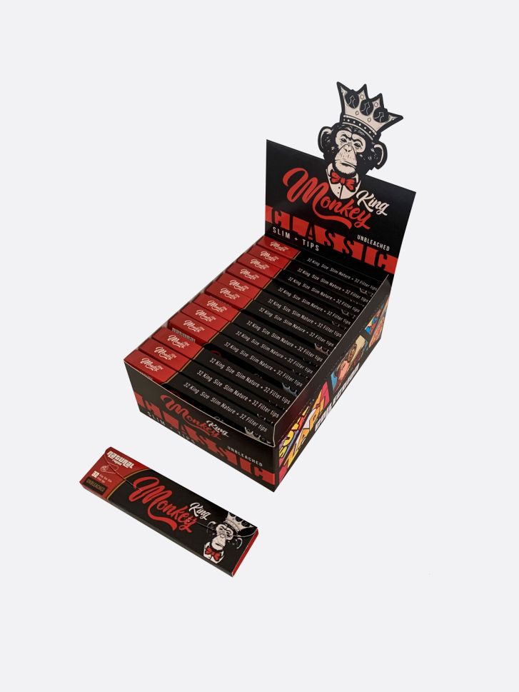 Hârtiile de rulat Monkey King CLASSIC King Size Slim sunt hârtii de rulat de înaltă calitate, create pentru o experiență curată și naturală. Fabricate din fibre naturale nealbite , nu conțin clor, coloranți sau substanțe chimice inutile, asigurând un gust mai curat și un impact minim asupra conținutului.