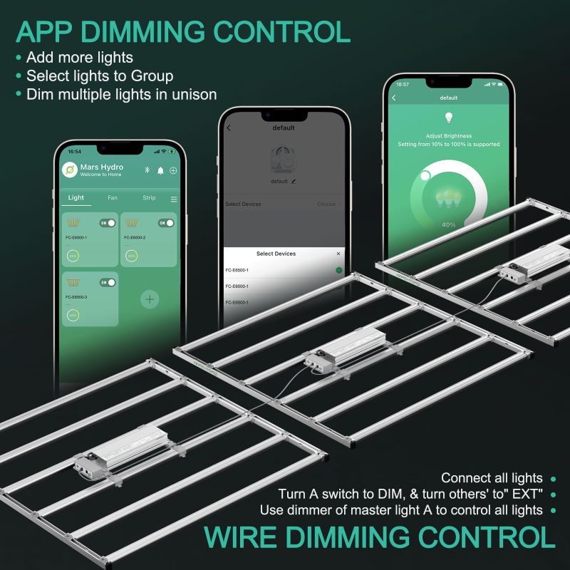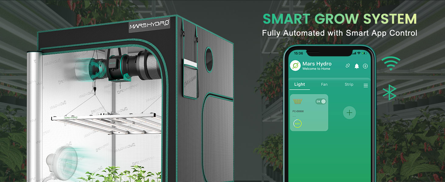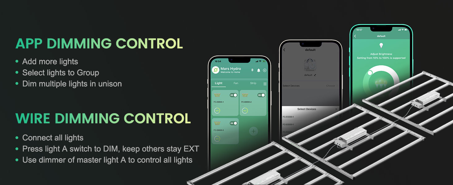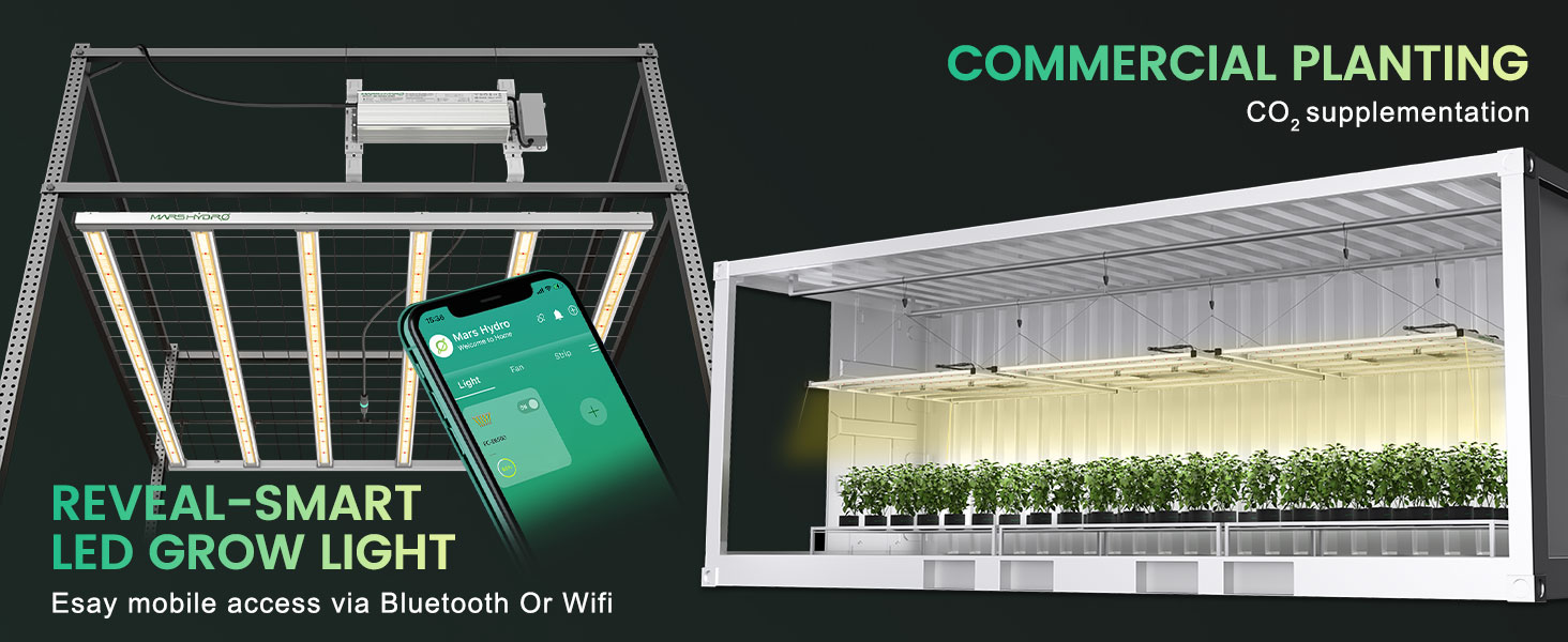 - Mars Hydro Smart Smart Grow System: lămpile inteligente de creștere din seria FC-E acceptă controlul mobil și programarea unui plan de cultivare prin intermediulaplicației Mars Hydro . Configurație precisă a intensității până la lună/zi/oră/minut pentru a obține niveluri dinamice de lumină și simularea răsăritului și apusului soarelui pentru a imita fotoperioada naturală la plante. Toate datele și setările sunt stocate și transferate prin tehnologia OTA , astfel încât utilizatorii pot avea acces instantaneu la cele mai recente actualizări prin WiFi.