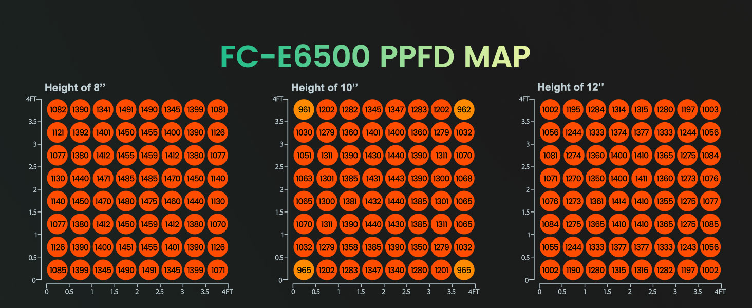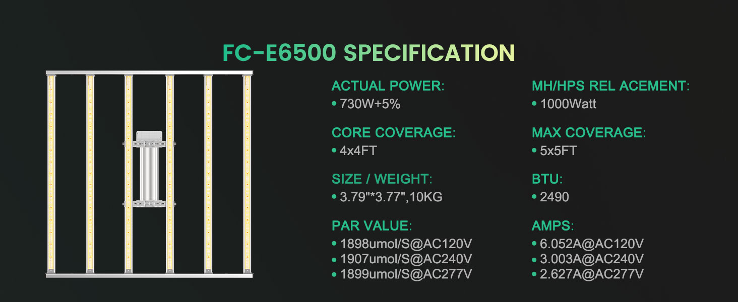 - Lumină de creștere LED de înaltă eficiență: Lampa de creștere LED FC-E 6500 folosește diode BridgeLux de înaltă calitate, atingând o eficiență de vârf în industrie de 2,8 µmol/J și un randament maxim de 2,5 grame per watt . Cu un PPFD mediu cu 30% mai mare în comparație cu alte lămpi de creștere de aceeași putere, oferă o calitate mai bună a recoltei și o rentabilitate mai bună, rezultând o reducere cu 50% a facturilor de energie electrică în comparație cu lămpile HID / HPS (sodiu).