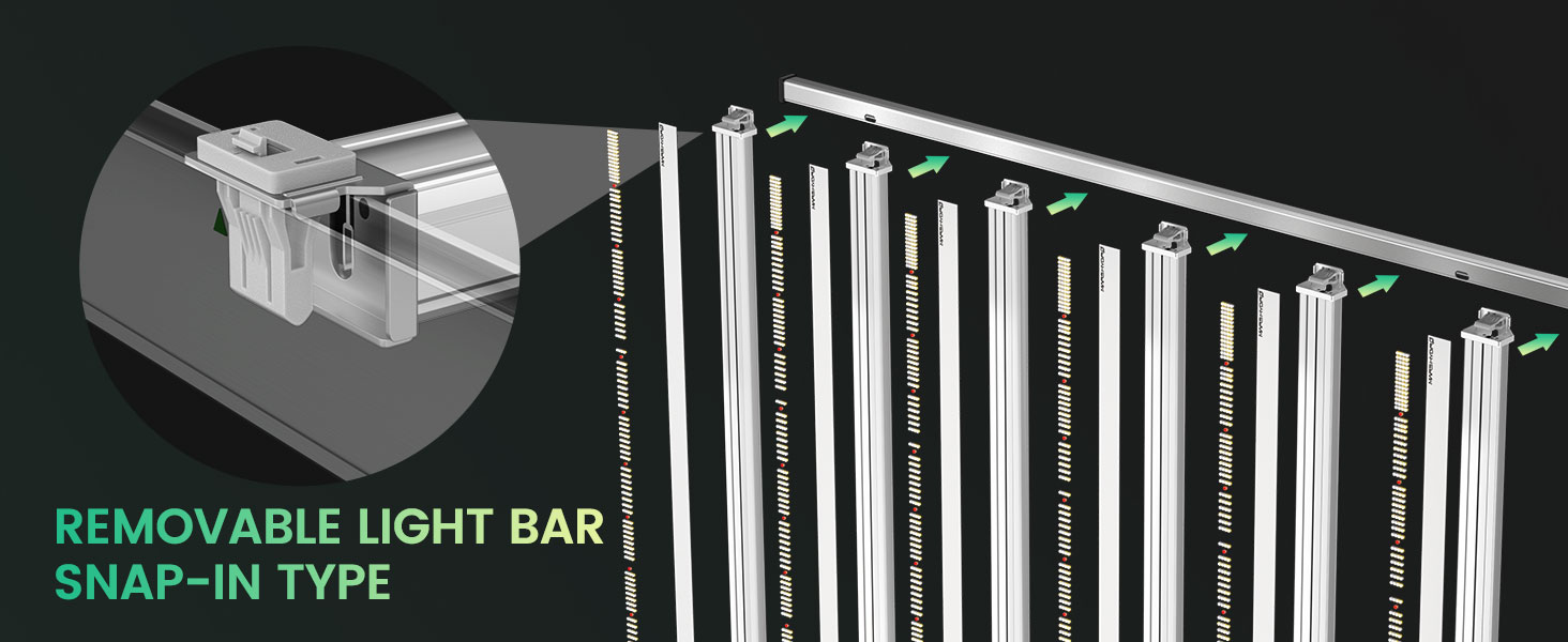 - Design inovator detașabil: benzile LED și sursa de alimentare pot fi îndepărtate cu ușurință, permițând grădinarilor să proiecteze iluminatul după cum doresc, într-un stil DIY. Pentru a obține o distribuție cât mai uniformă a luminii, benzile cu LED-uri trebuie plasate în locațiile recomandate (marcate cu săgeți verzi), ceea ce poate duce la recolte consistente și de înaltă calitate.