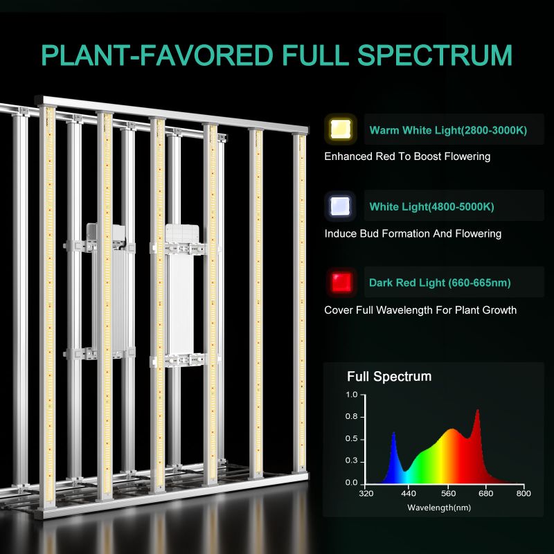 - Lumină de creștere cu spectru complet : Cu un spectru de randament maxim (660-665nm, 2800k-3000k, 4800-5000k) care se încadrează în principal în intervalul PAR (400-700nm), lumina de creștere cu LED FC-E 6500 activează fotosinteza și oferă suficientă lumină pentru a face plantele să crească mai puternice și mai sănătoase.