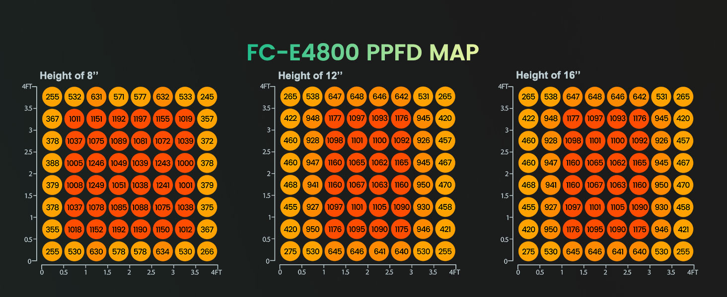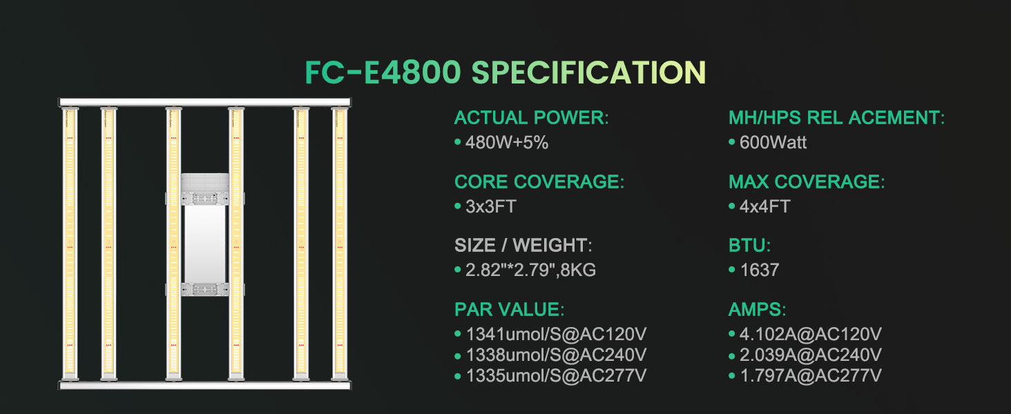 - Lumină de creștere LED de înaltă eficiență: Lampa de creștere LED FC-E 4800 folosește diode BridgeLux de înaltă calitate, atingând o eficiență de vârf în industrie de 2,8 µmol/J și un randament maxim de 2,5 grame per watt . Cu un PPFD mediu cu 30% mai mare în comparație cu alte lămpi de creștere de aceeași putere, oferă o calitate mai bună a recoltei și o rentabilitate mai bună, rezultând o reducere cu 50% a facturilor de energie electrică în comparație cu lămpile HID / HPS (sodiu).