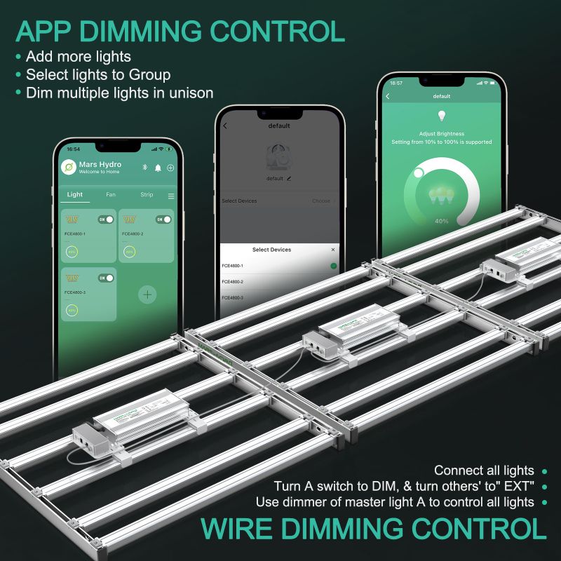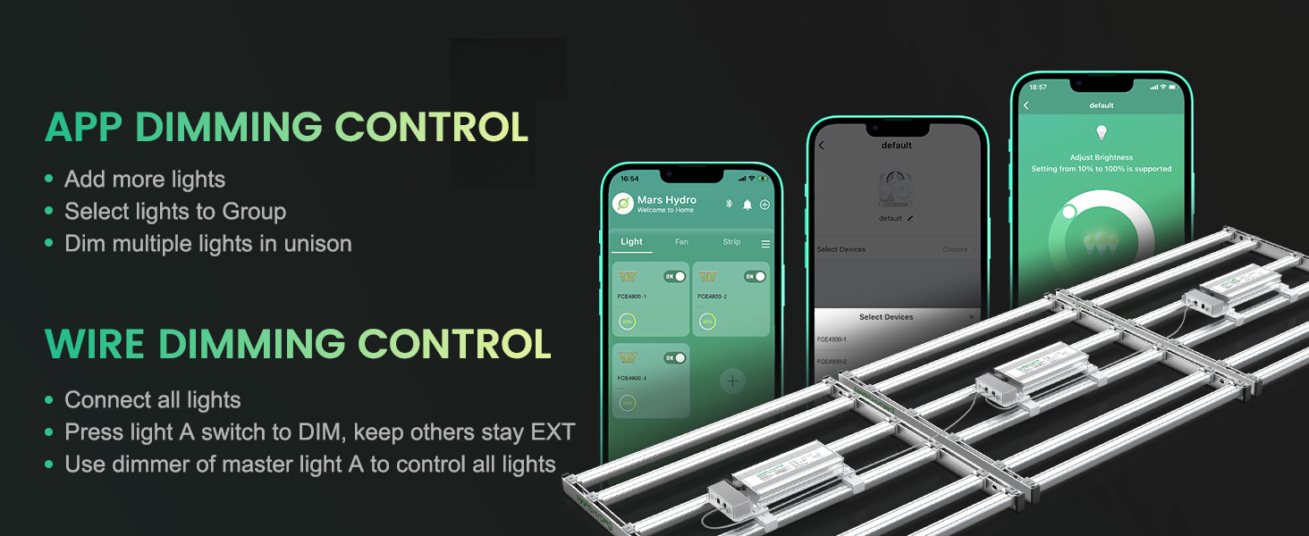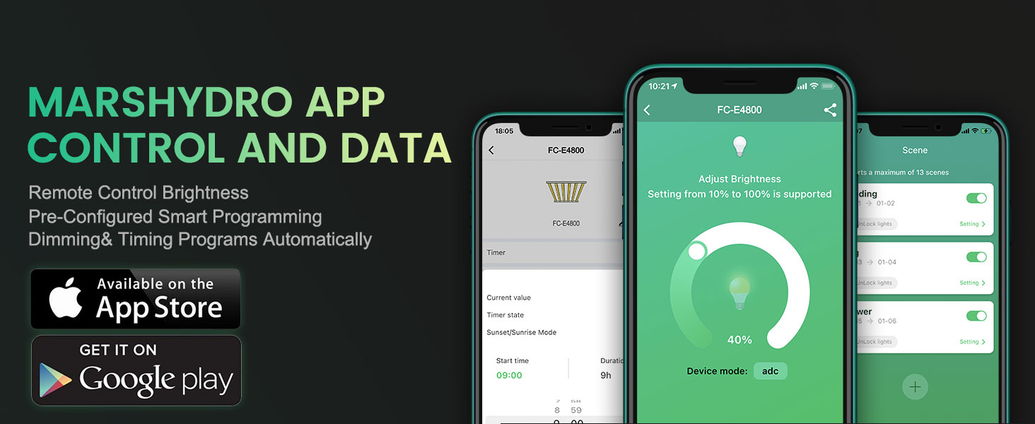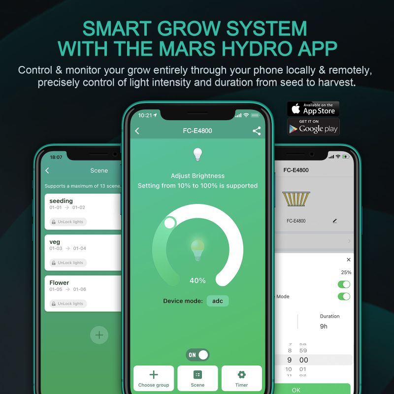 - Mars Hydro Smart Smart Grow System: lămpile inteligente de creștere din seria FC-E acceptă controlul mobil și programarea unui plan de cultivare prin intermediulaplicației Mars Hydro . Configurație precisă a intensității până la lună/zi/oră/minut pentru a obține niveluri dinamice de lumină și simularea răsăritului și apusului soarelui pentru a imita fotoperioada naturală la plante. Toate datele și setările sunt stocate și transferate prin tehnologia OTA , astfel încât utilizatorii pot avea acces instantaneu la cele mai recente actualizări prin WiFi.