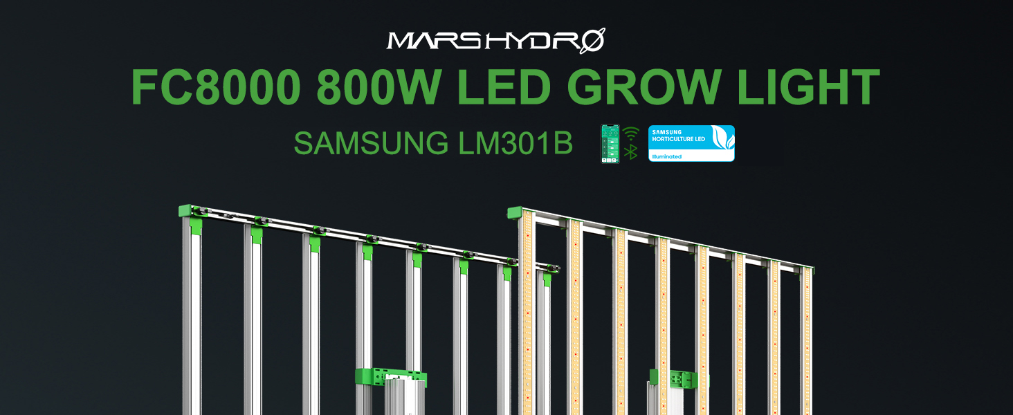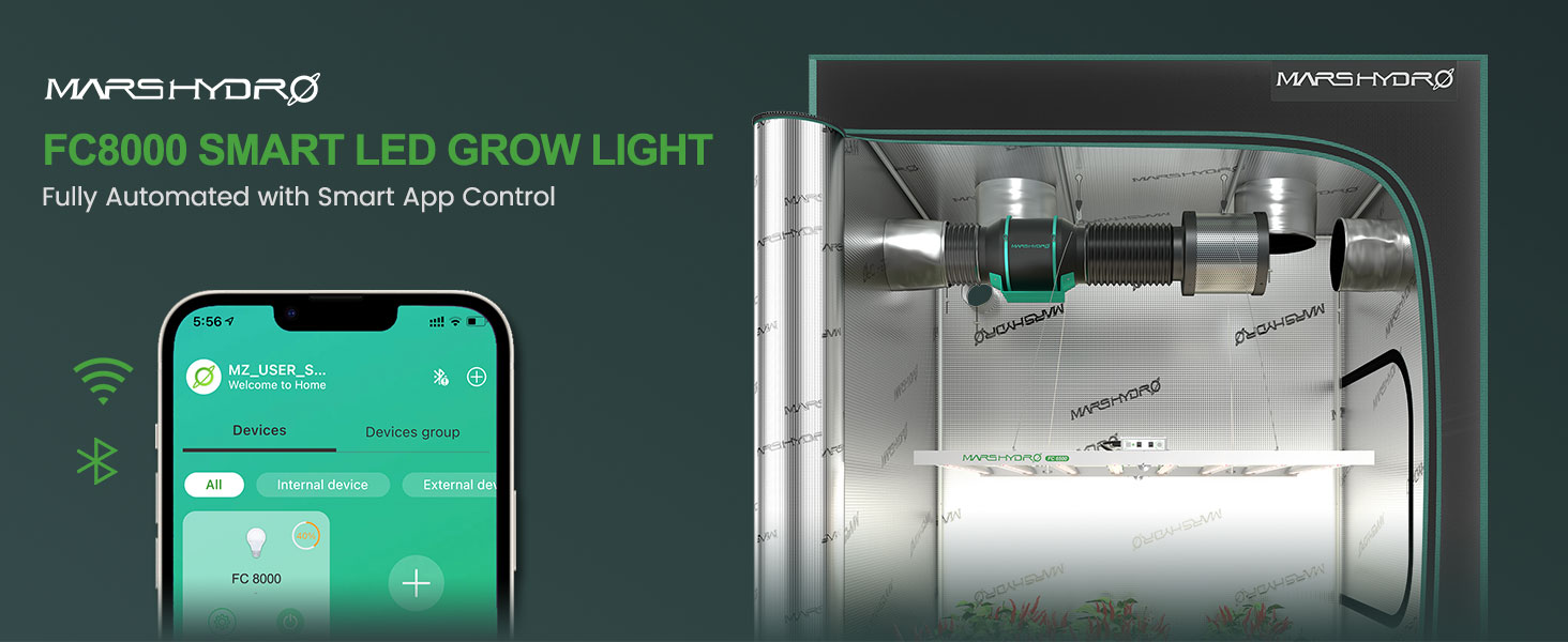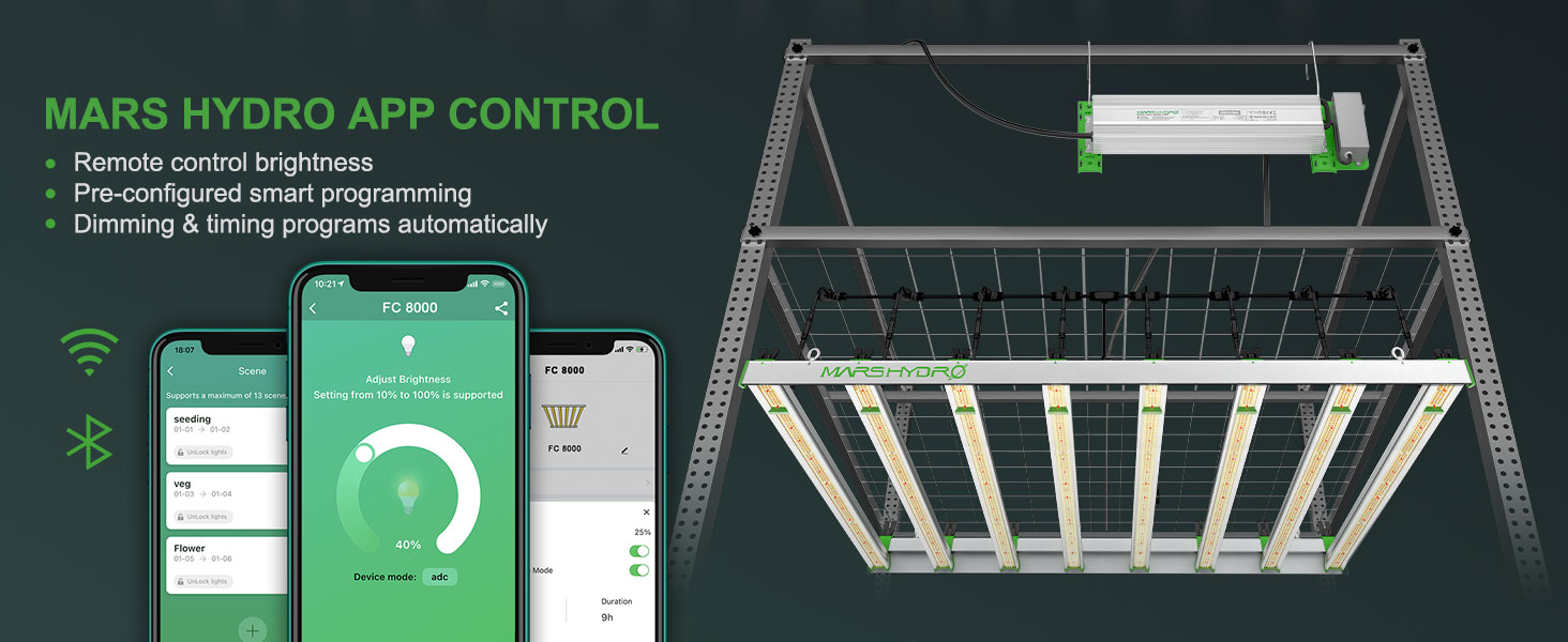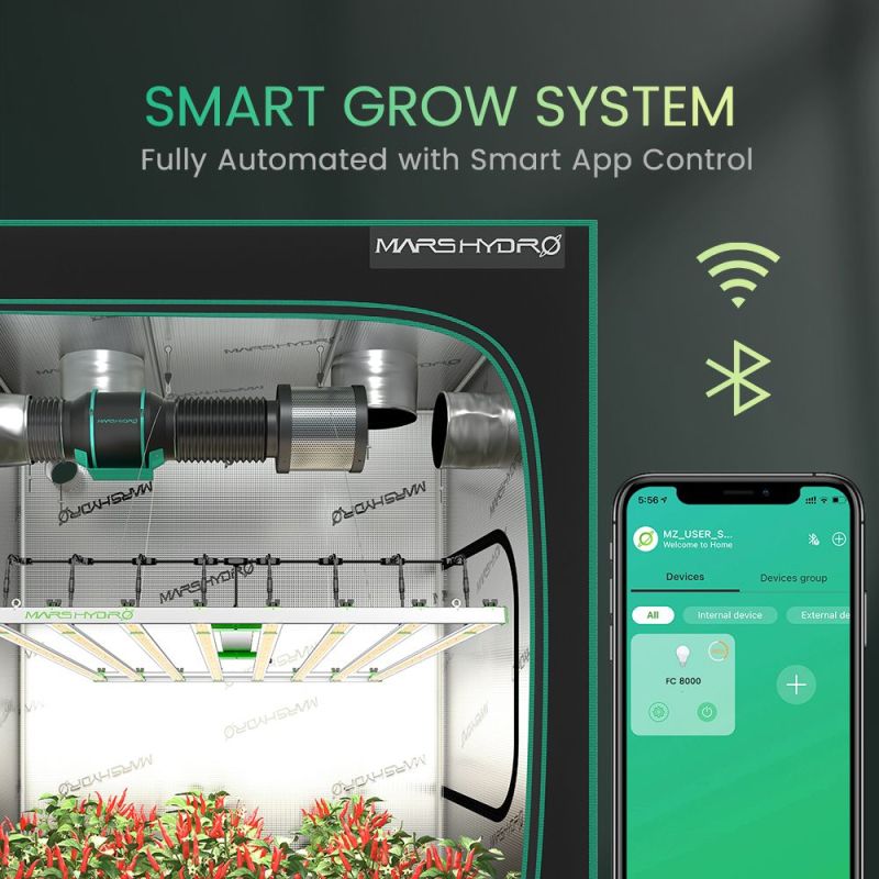 Mars Hydro Smart FC 8000 Samsung LM301B 800W LED Grow Light este un kit complet de lumină LED pentru cultivarea plantelor acasă (cort). Smart FC 8000 oferă control prin intermediulaplicației Mars Hydro prin telefon mobil sau Wi-Fi, inclusiv planificarea creșterii , reglarea automată a luminii , programarea în timp și planul de creștere , potrivite pentru cultivarea comercială pe scară largă sau cultivarea acasă de înaltă calitate. Smart FC 8000 asigură o emisie uniformă de lumină de 1500 μmol/m²/s , suficientă pentru a activa fotosinteza 100% și a obține un randament maxim la diferite concentrații de CO 2 .