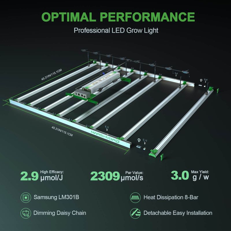 - Lampă LED cu randament ridicat: Smart FC 8000 echipat cu cele mai vândute diode Samsung LM301B , construite pentru proiecte și studii de proiecte de vârf în industrie, oferă o eficiență lider pe piață de 2,85 μmol/J și un PPFD mediu cu 30% mai mare de 1000 μmol/m 2 /s , promițând un randament mai mare de 3 grame pe watt și o creștere cu 50% a producției în comparație cu vechile lumini blurple și HPS. Seria FC este cea mai bună linie de iluminat de lumini de creștere Mars Hydro LED!