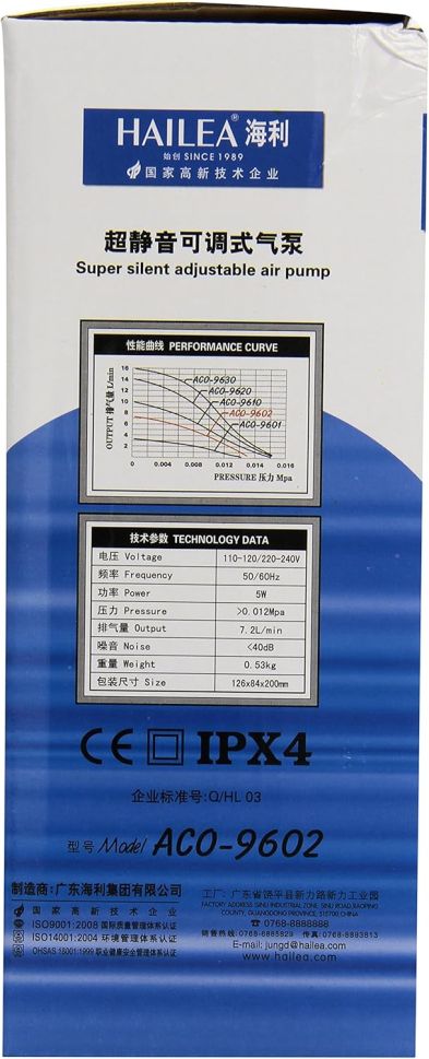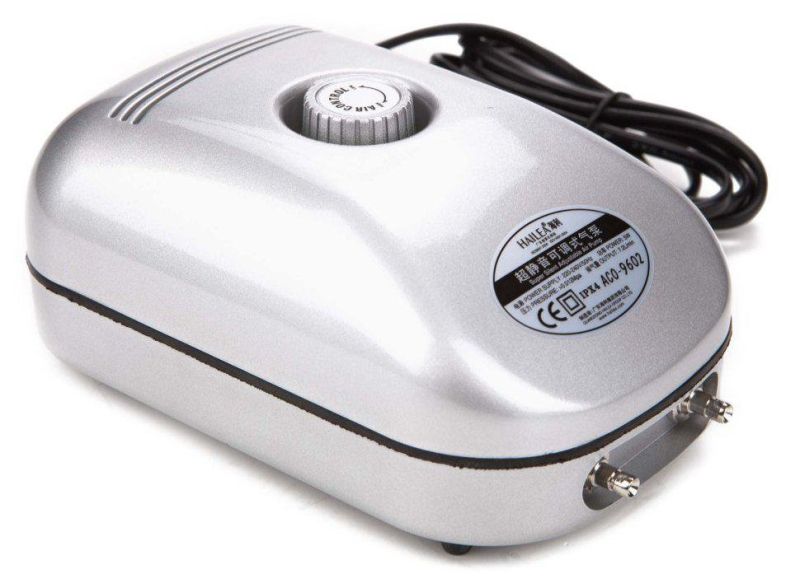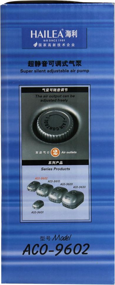 Hailea ACO-9602 oferă un echilibru bun între dimensiune, putere și performanță: debitul de 7,2 l/min, debitul reglabil, nivelul redus de zgomot și ieșirile duble fac ca modelul să fie potrivit pentru o varietate de sisteme aerate - de la acvarii la hidroponie.