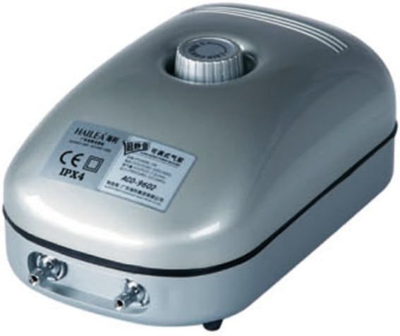 - Pompă de aer Hailea ACO-9602 silențioasă și reglabilă, cu un debit de până la 7,2 l/min (432 l/h) și 2 ieșiri - ideală pentru aerarea acvariilor, acvariilor și sistemelor hidroponice.