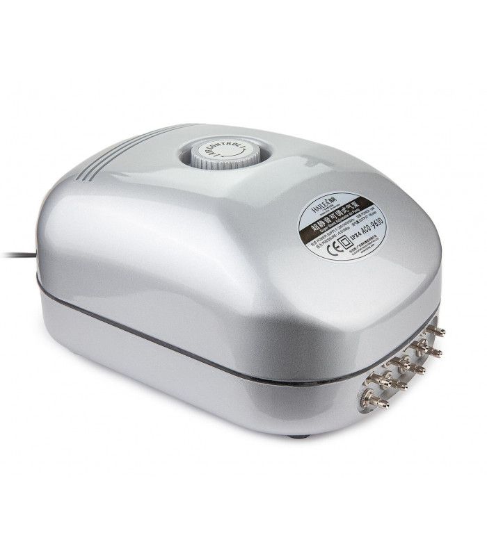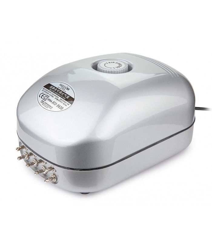 Pompă de aer Hailea ACO-9630 reglabilă și silențioasă, cu un debit de până la 16 L/min (960 L/h) și 8 ieșiri - ideală pentru aerarea acvariilor, sistemelor hidroponice și acvariilor.