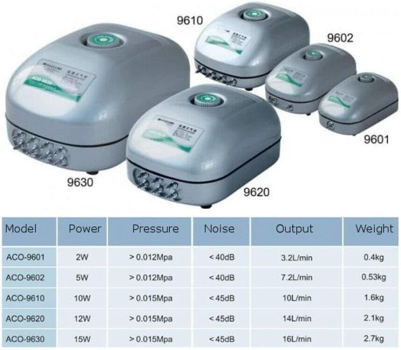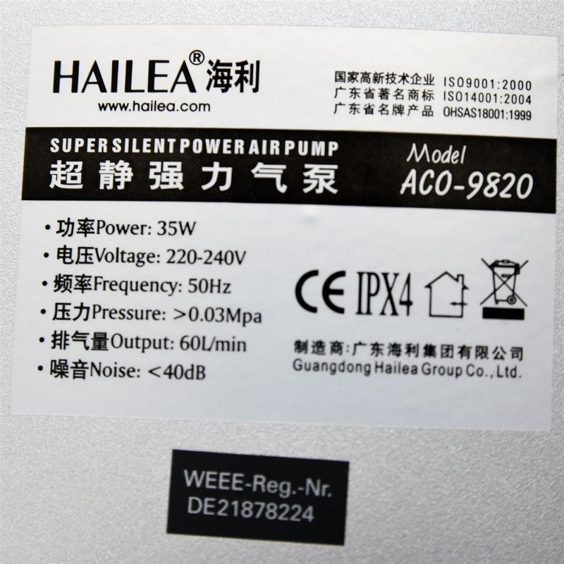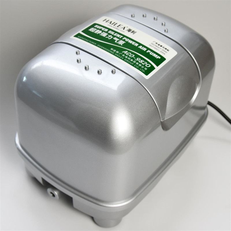- Model: ACO-9820 — Seria de pompe de aer Hailea cu debit mare și funcționare silențioasă.